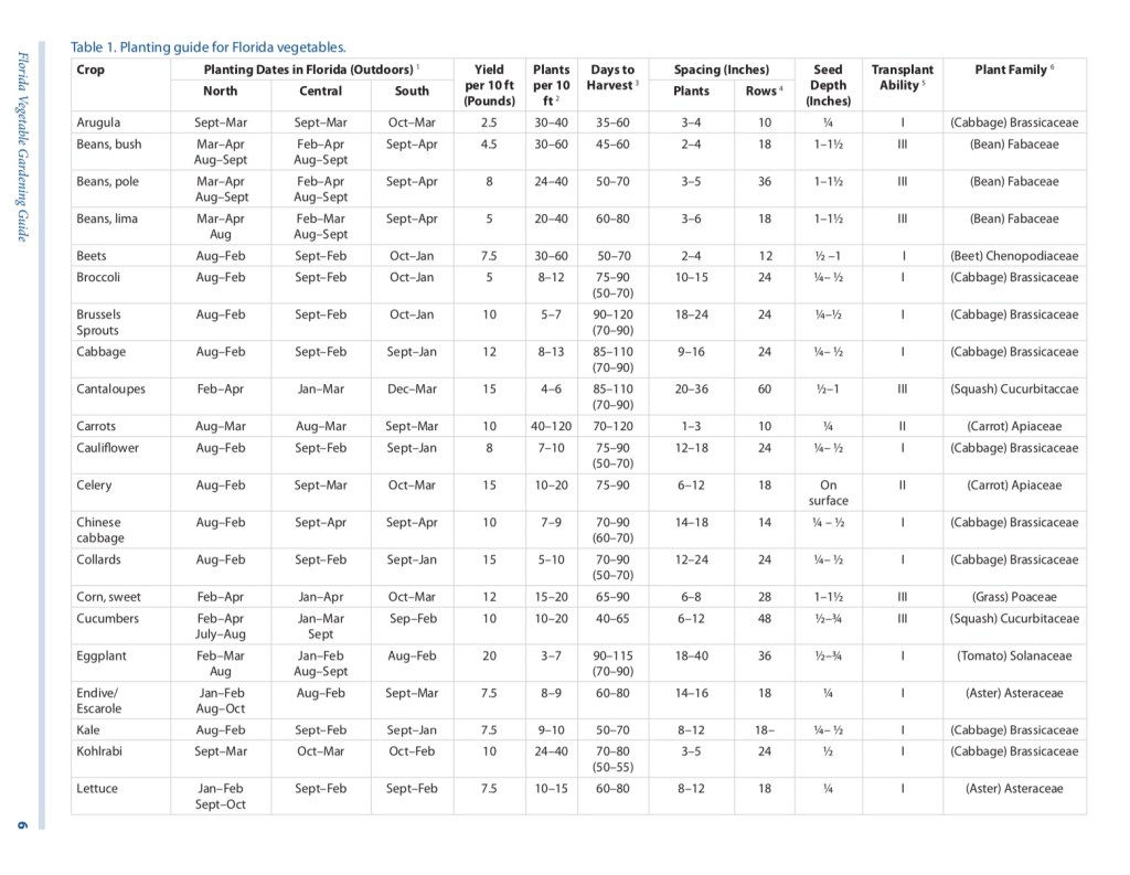 The University of Florida is an AMAZING resource when it comes to Florida agriculture. From goat management, wildflower planting, common chicken illnesses, and more, UF provides so much information for Floridians to utilize. The UF Gardening Guide provides information such as planting dates in Florida, how many days from seed to harvest, how far apart of plant, how deep to plant, and beyond! The biggest thing to know is where you are located. North Florida is considered anything north of State Road 40. Central Florida is the section between State Roads 40 and 70. South Florida is anything below State Road 70. This reference is ONLY for using the UF Gardening Guide so keep that in mind. Once you’ve figured out if you’re North, Central, or South, it makes the guide easy to use.