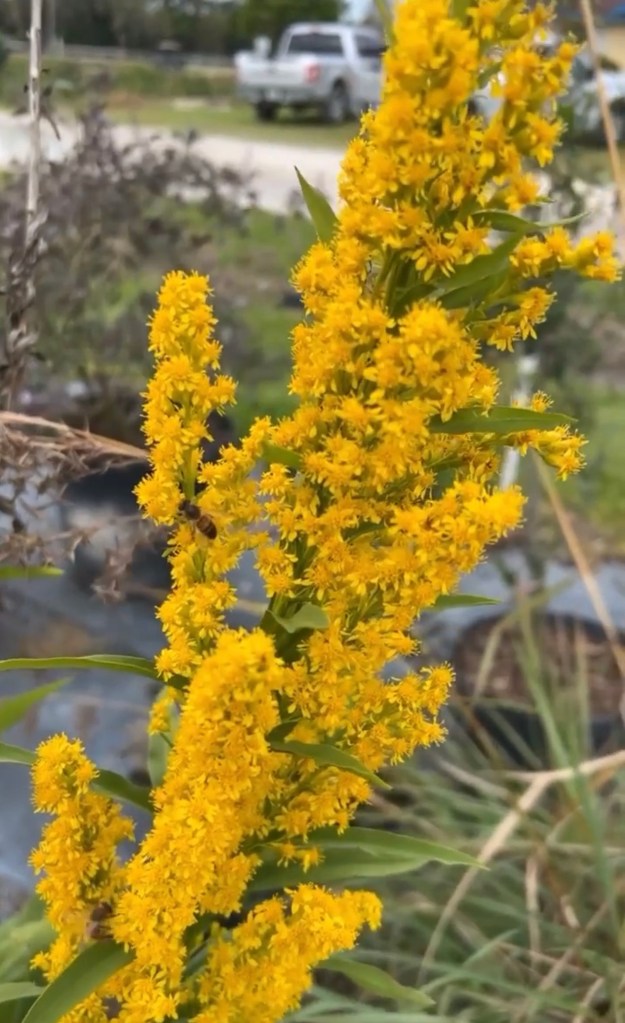 - Goldenrod- A Florida Native that the bees go crazy for!! This plant self-seeds (so around a pond or in a field is best) and produces large yellow flower spikes that the bees just can’t resist!)