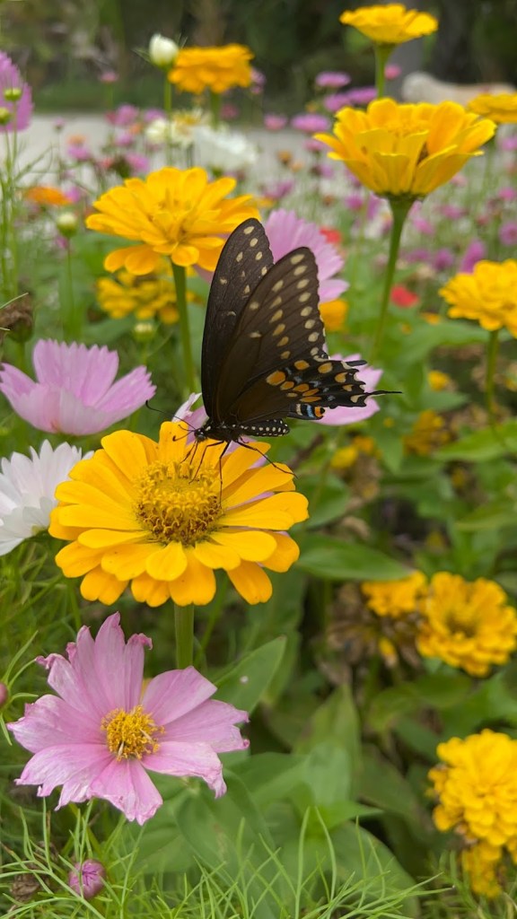 - Zinnias & Cosmos- We couldn’t help but throw our annuals in here from our cut flower garden. We could sit all day in our chairs and watch the pollinators jump from flower to flower enjoying our small garden. They may only last a season, but with all the other plants above in our yard, it’s okay to have some annuals!