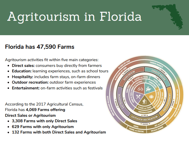 You may remember our previous blog from 2024, Momentum for Manatee County Agriculture, where the Agriculture Census numbers were broken down to show the many factors farms are facing just to continue to operate. To summarize, there has been a consistent increase in production costs, but the value of agriculture products farms are producing are decreasing. Higher costs and less money for their products puts many farms in a precarious position. In addition, land prices continue to rise (about 1 million dollar increase in the last 5 years) which certainly weighs on the position at hand. Sadly, sometimes the choice becomes, sell the farm or figure out a way to survive. That’s where agritourism has stepped in to keep many operations in business for the last decade. According to a 2017 study by Penn State, Florida has 4,069 farms that have some form of agritourism offered.